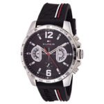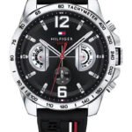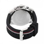 The sleek black dial is complemented by chronograph sub-dials and the iconic Tommy Hilfiger logo, delivering a refined yet sporty look. Built with a durable stainless steel case and strap, this watch ensures long-lasting wear and comfort.